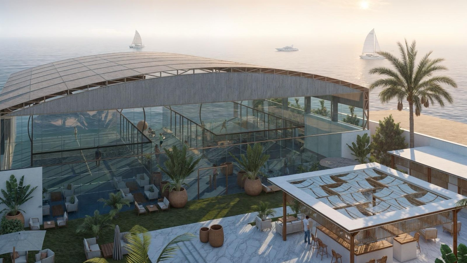 Architectural Glass Courts: Two professional-grade padel courts housed within a spectacular, climate-controlled glass structure. This allows for year-round play while maintaining panoramic views of the sea and the iconic JYC "Sail" building.Luxury Social Hub: A expansive outdoor social area featuring a central "Juice Bar," marble-paved walkways, and high-end Mediterranean-style lounge seating set on premium artificial turf.Modern Coastal Aesthetic: The design utilizes natural wood pergolas, tropical landscaping, and a clean white architectural palette to harmonize with the luxury marina environment.VIP Amenities: Integration of private lounge areas, professional-grade lighting for night play, and a seamless transition between the sports facilities and the yacht club’s main social promenade.