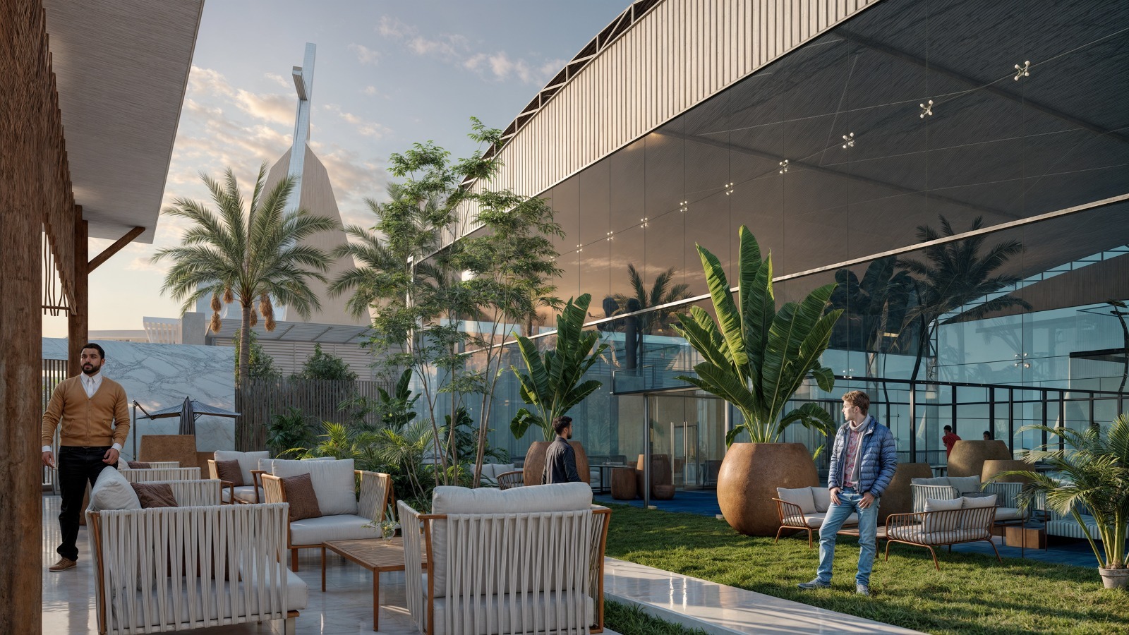 Architectural Glass Courts: Two professional-grade padel courts housed within a spectacular, climate-controlled glass structure. This allows for year-round play while maintaining panoramic views of the sea and the iconic JYC "Sail" building.Luxury Social Hub: A expansive outdoor social area featuring a central "Juice Bar," marble-paved walkways, and high-end Mediterranean-style lounge seating set on premium artificial turf.Modern Coastal Aesthetic: The design utilizes natural wood pergolas, tropical landscaping, and a clean white architectural palette to harmonize with the luxury marina environment.VIP Amenities: Integration of private lounge areas, professional-grade lighting for night play, and a seamless transition between the sports facilities and the yacht club’s main social promenade.